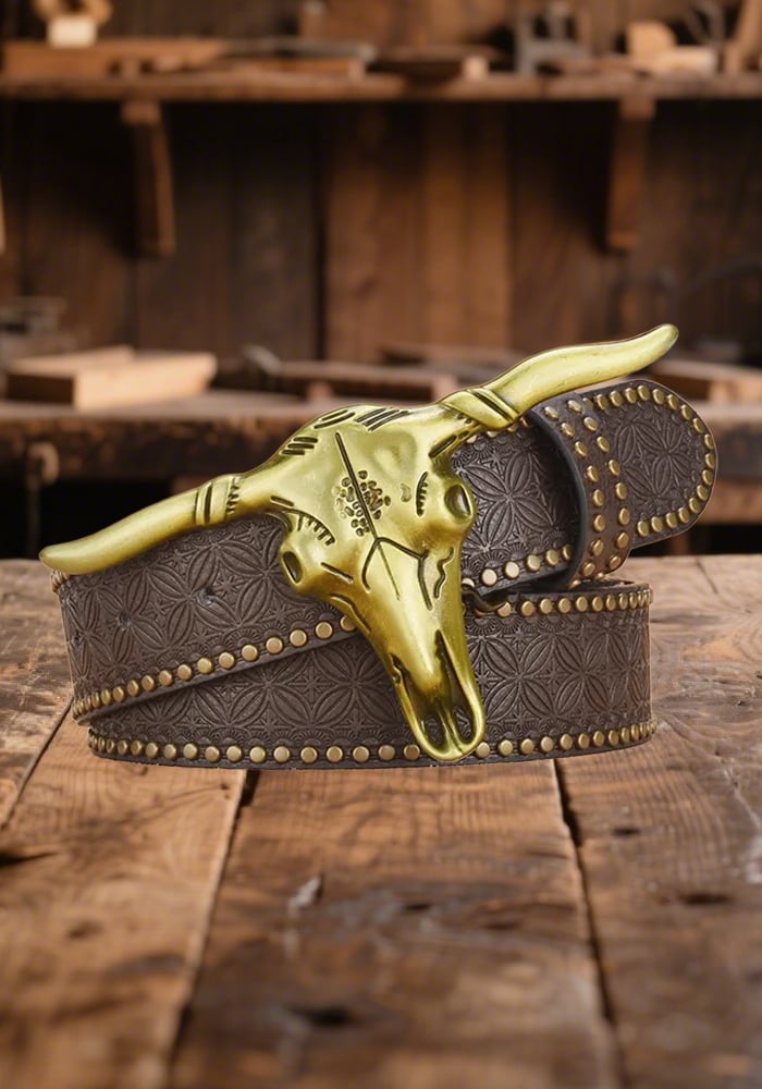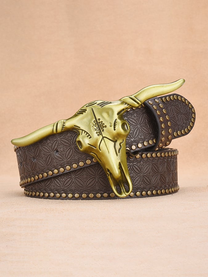 Men's Vintage Outdoor Leather Embossed Western Bullhead Belt