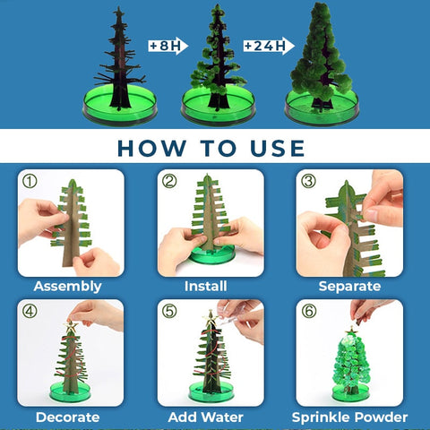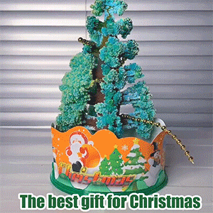 Transforms from cardboard into a bushy tree in just 6-12 hours! Simply add the nutrient water that included and get your grown-up Christmas tree the next day! Magically grow crystals on the cardboard branches.