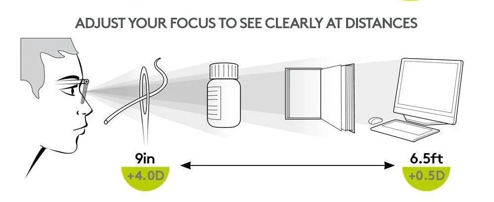 You can customize for crystal clear 20/20 vision in seconds. See up close, far away, extremely close, middle distances, any distance.