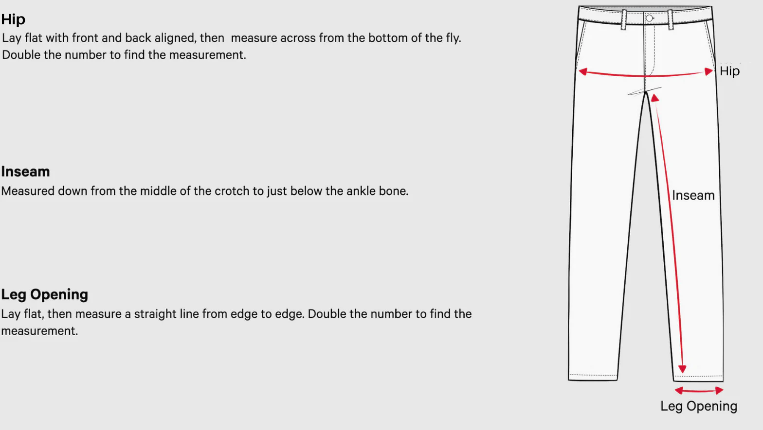 Measured down from the middle of the crotch to just below the ankle bone. We recommend you choose based on your height. If you're in between sizes, you'll need to cuff with the longer size. People with longer than usual legs should size up.