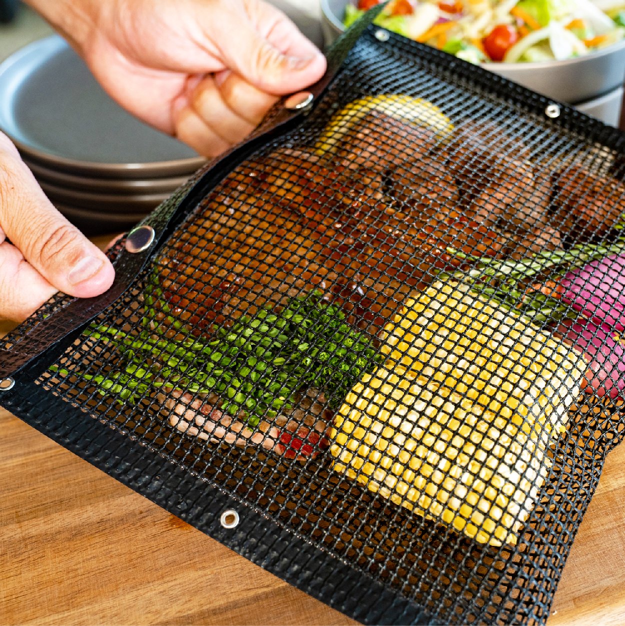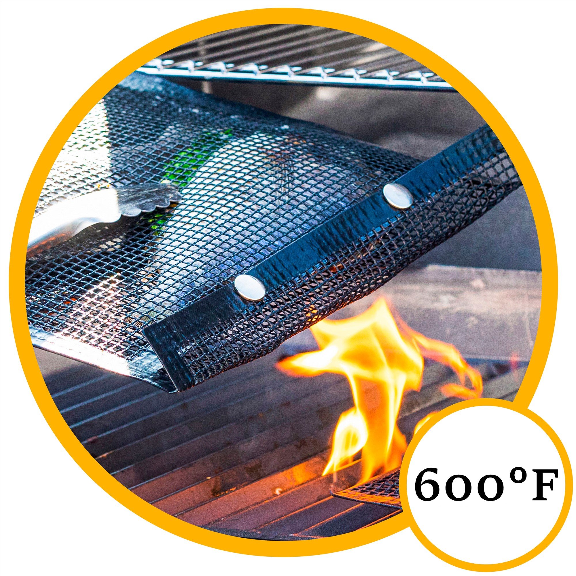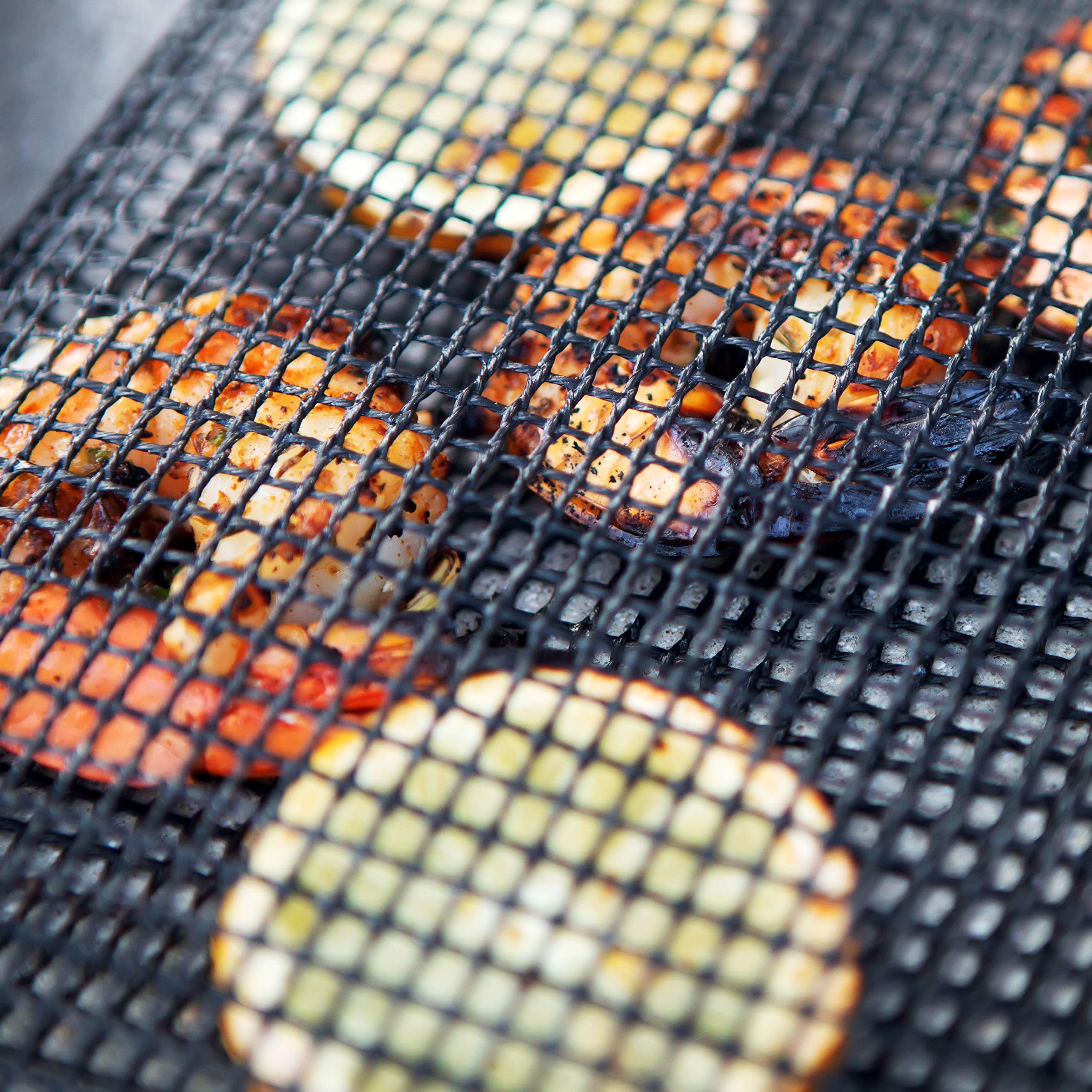 Made of eco-friendly premium, food-grade PTFE material, flexible mesh material, non-toxic, odorless. Also, each bag comes equipped with stainless steel reinforced, tear-resistant eyelets that keep the bags intact after every grilling session.